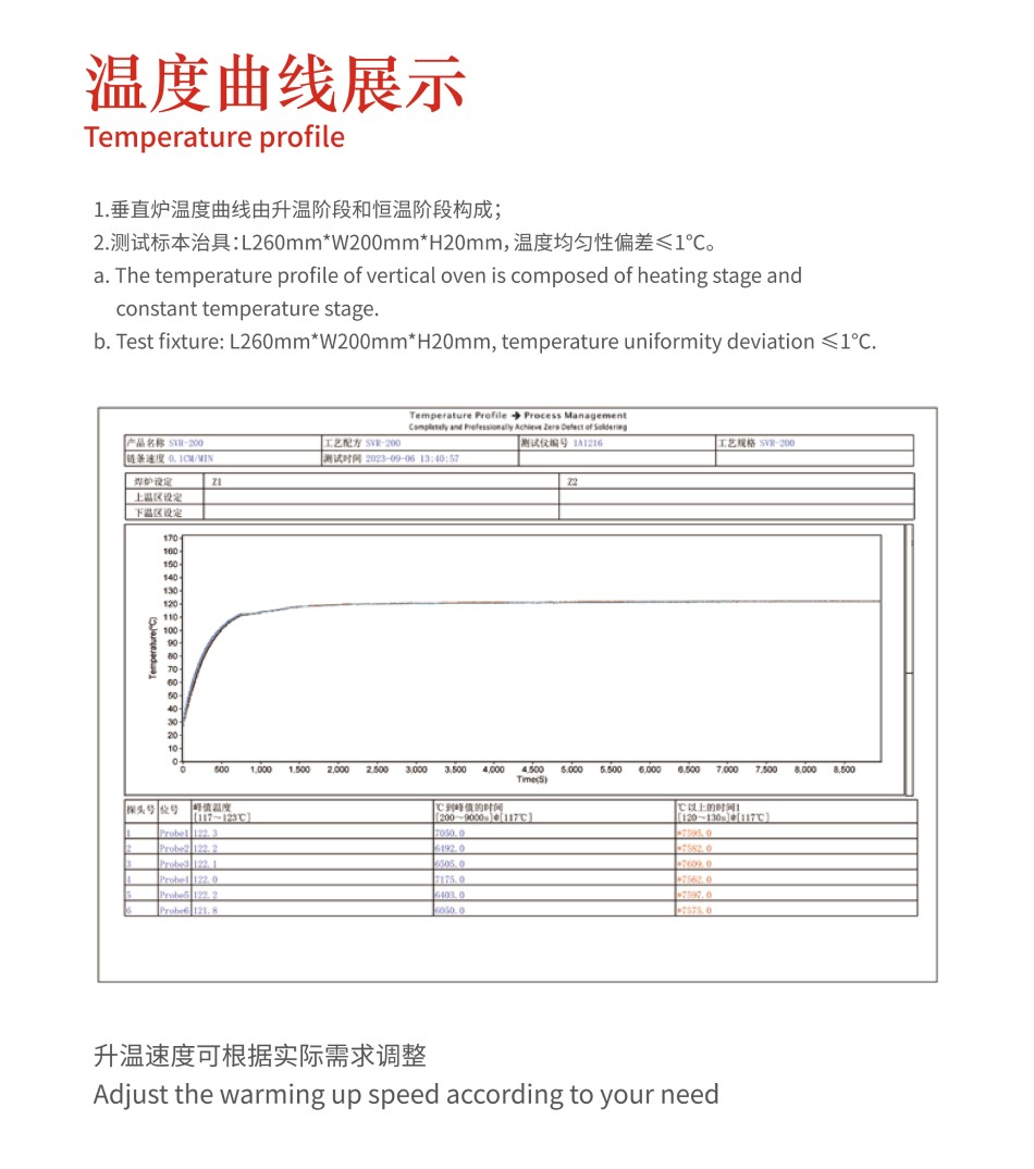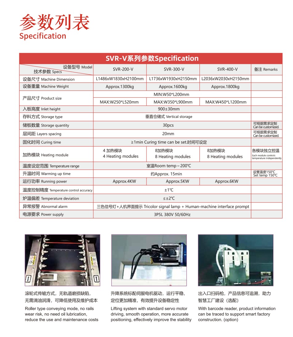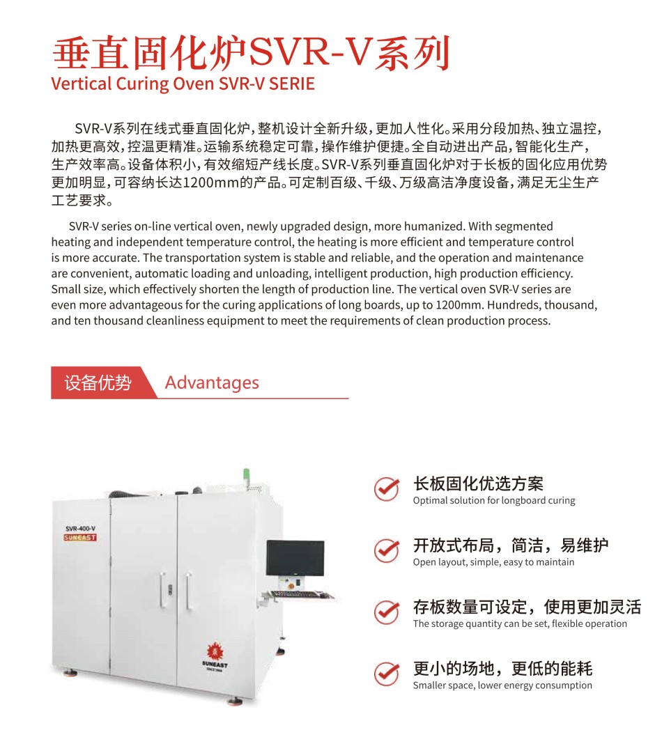 SVR-V系列在线式垂直固化炉,整机设计全新升级,更加人性化。采用分段加热、独立温控,加热更高效,控温更精准。运输系统稳定可靠,操作维护便捷。全自动进出产品,智能化生产,生产效率高。设备体积小,有效缩短产线长度。SVR-V系列垂直固化炉对于长板的固化应用优势更加明显,可容纳长达1200mm的产品。可定制百级、千级、万级高洁净度设备,满足无尘生产工艺要求。