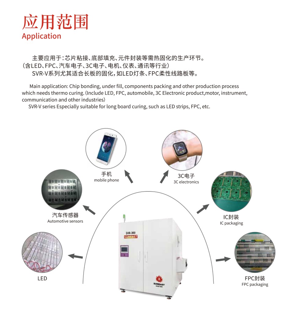 主要应用于:垂直炉SVR-V系列尤其适合长板的固化,如LED灯条、FPC柔性线路板等。