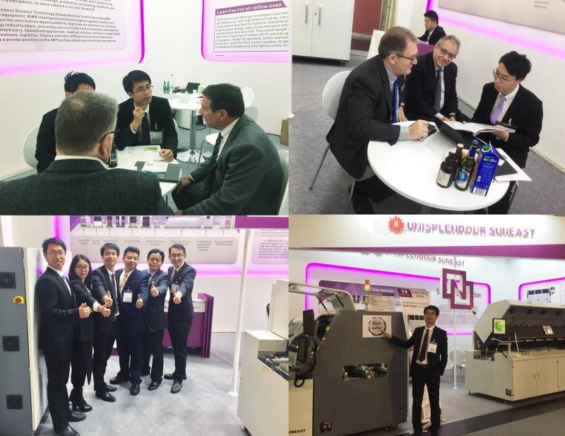 2017年11月14日至17日,Productronica2017在德国慕尼黑新国际博览中心举行。日东科技携选择性波峰焊SUNFLOW3、无铅回流焊SER706A、全自动锡膏印刷机SL120亮相Productronica2017展。