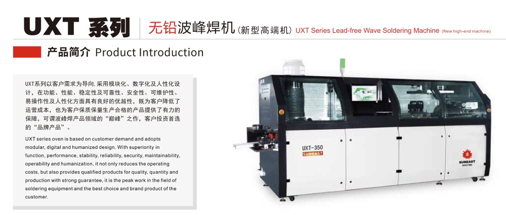 波峰焊UXT系列以客户需求为导向, 采用模块化、数字化及人性化设计,在功能、性能、稳定性及可靠性、安全性、可维护性、易操作性及人性化方面具有良好的优越性,既为客户降低了运营成本,也为客户保质保量生产合格的产品提供了有力的保障,可谓波峰焊产品领域的“巅峰”之作,客户投资首选的“品牌产品”。