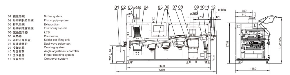 ●锡炉系统,内胆采用特殊材料,内表面防腐蚀处理。(新型喷口固定方式,便于装卸;自动导流装置,便于收集锡渣,波峰形状可调节)锡炉温度控制精度±2℃,锡炉进出、升降电动手动均可,操作方便。