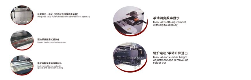 ●预热系统采用微热风+远红外发热管方式,三段预热温区,抽屉式模块化设计,灵活选择混合预热模式。温度均匀稳定。