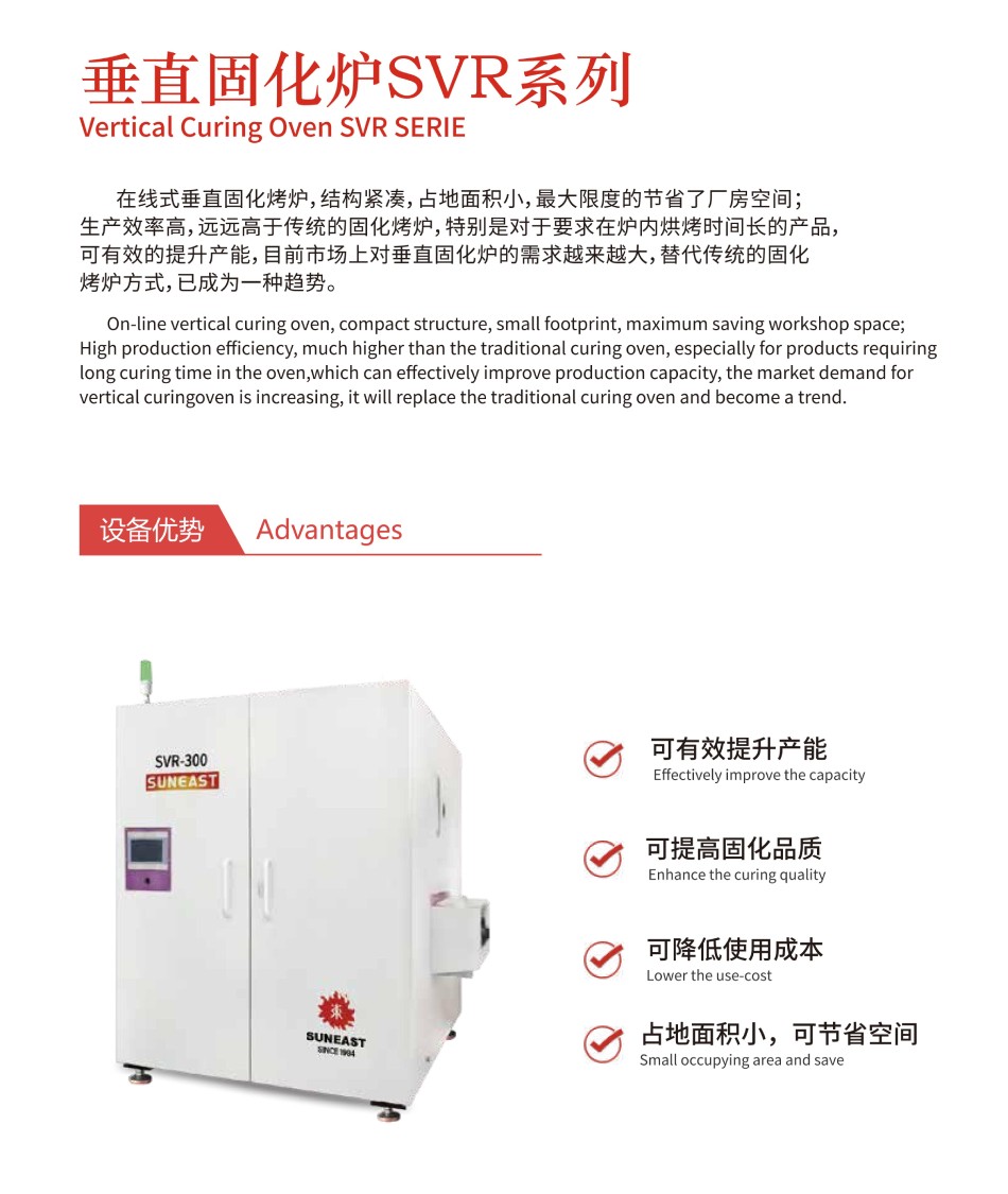 在线式垂直回流烤炉,结构紧凑,占地面积小,最大限度的节省了厂房空间;生产效率高,远远高于传统的固化烤炉,特别是对于要求在炉内烘烤时间长的产品,可有效的提升产能,目前市场上对垂直回流炉的需求越来越大,替代传统的固化烤炉方式,已成为一种趋势。