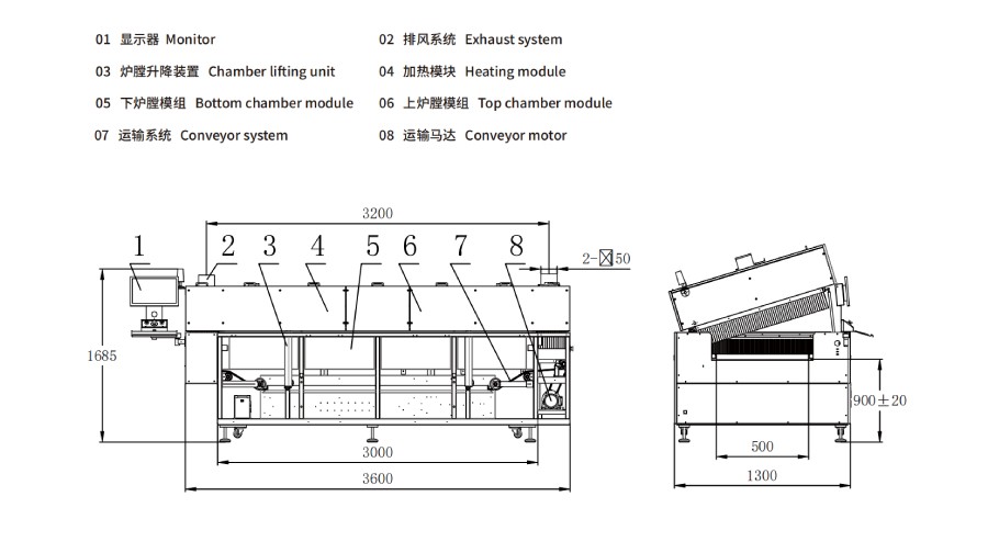 | 1.可选:机头机尾可凸出,凸出上炉膛外侧面尺寸300mm(整机尺寸会加长600mm)。 2.注明:根据产能要求,推荐温区数量优先选择:4温区、5温区、 8温区、9温区、10温区、12温区,可定制。 | |||