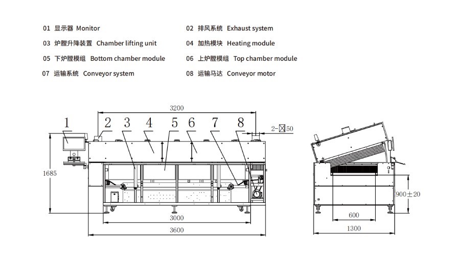 1.可选:机头机尾可凸出,凸出上炉膛外侧面尺寸300mm(整机尺寸会加长600mm)。 2.注明:根据产能要求,推荐温区数量优先选择:4温区、5温区、 8温区、9温区、10温区、12温区,可定制。 |