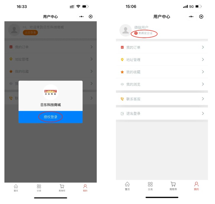 进入首页需先点击-我的-点击登录-授权登录 –绑定企业,完善企业资料。详细操作如下图所示: