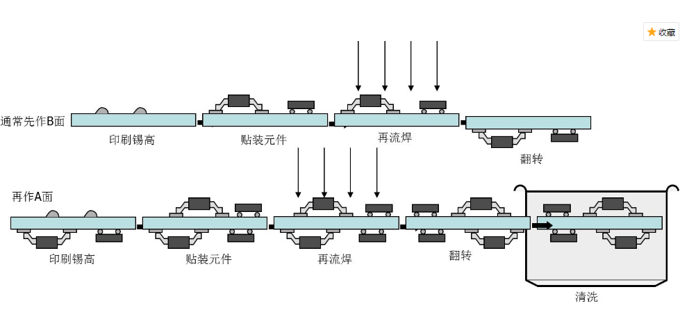 B,双面贴装:A面预涂锡膏→贴片(分为手艺贴装和机器主动贴装)→回流焊→B面预涂锡膏→贴片(分为手艺贴装和机器主动贴装)→回流焊→查看及电测验。