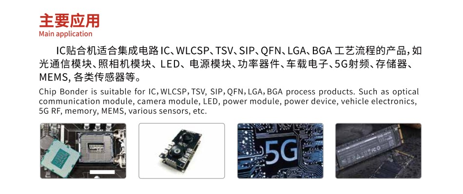 IC贴合机主要应用:IC贴合机适合集成电路IC、WL CSP、TSV、SIP、QFN、LGA、BGA工艺流程的产品, 如光通信模块、照相机模块、LED、电源模块、功率器件、车载电子、5G射频、存储器、MEMS, 各类传感器等。