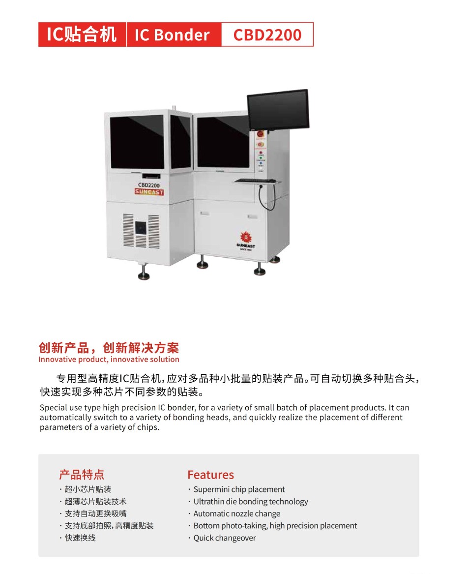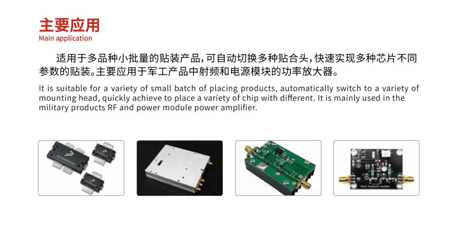 专用型高精度固晶贴合机,适用于多品种小批量的贴装产品,可自动切换多种贴合头,快速实现多种芯片不同参数的贴装。主要应用于军工产品中射频和电源模块的功率放大器。