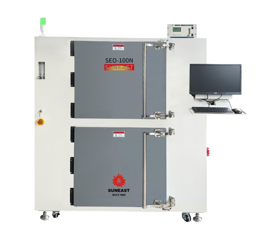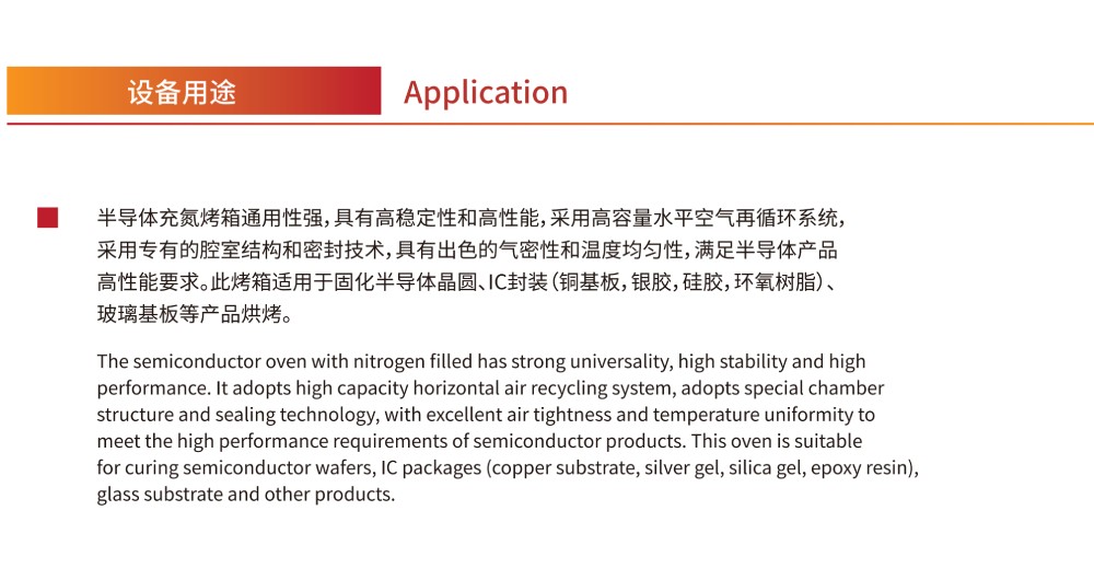 半导体充氮烤箱通用性强,具有高稳定性和高性能,采用高容量水平空气再循环系统,采用专有的腔室结构和密封技术,具有出色的气密性和温度均匀性,满足半导体产品高性能要求。此烤箱适用于固化半导体晶圆、IC封装(铜基板,银胶,硅胶,环氧树脂)、玻璃基板等产品烘烤。