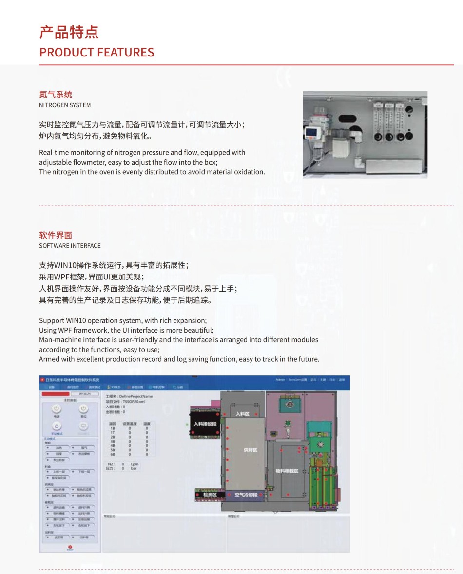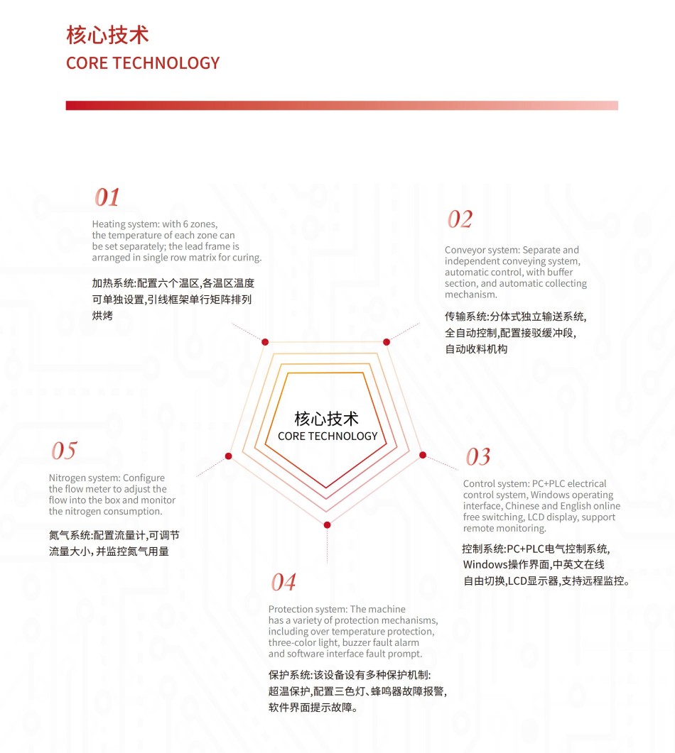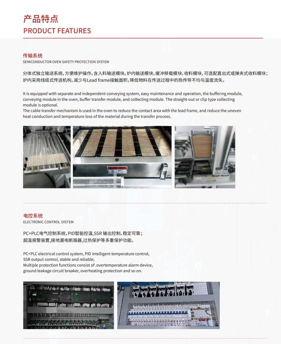 加热系统:配置六个温区,各温区温度可单独设置,引线框架单行矩阵排列烘烤。