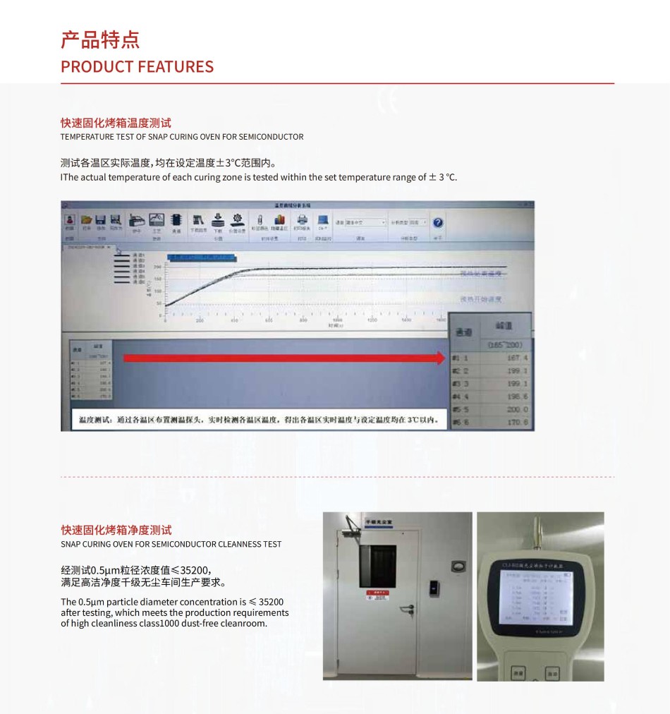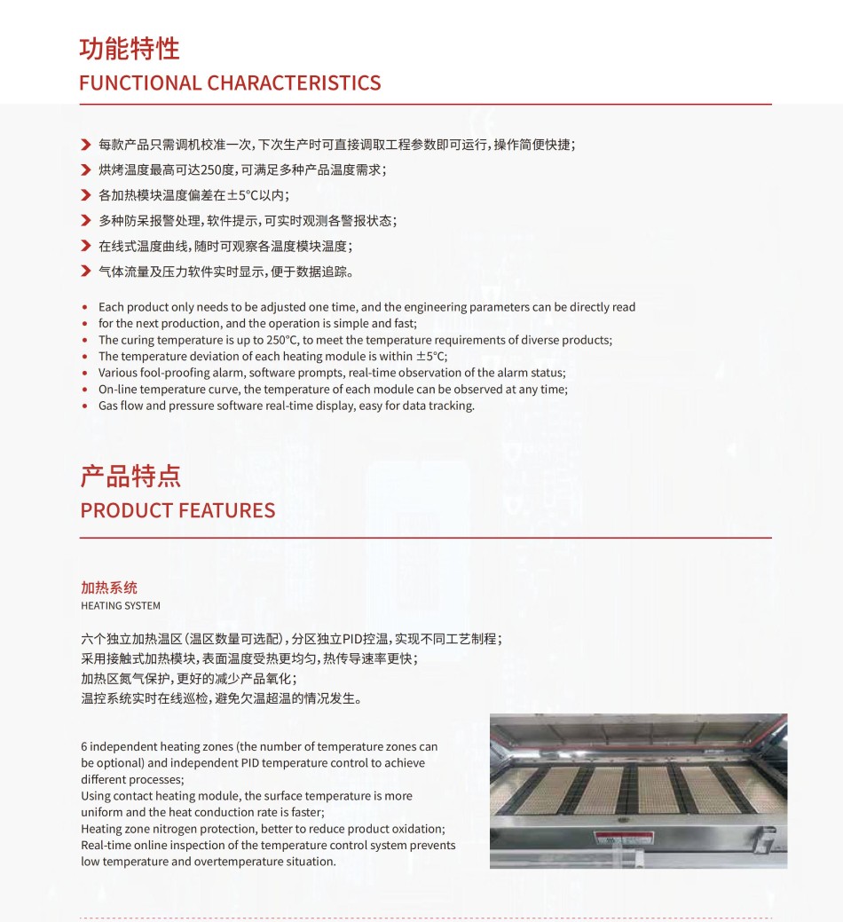 烘烤温度最高可达250度,可满足多种产品温度需求;各加热模块温度偏差在±5°C以内;