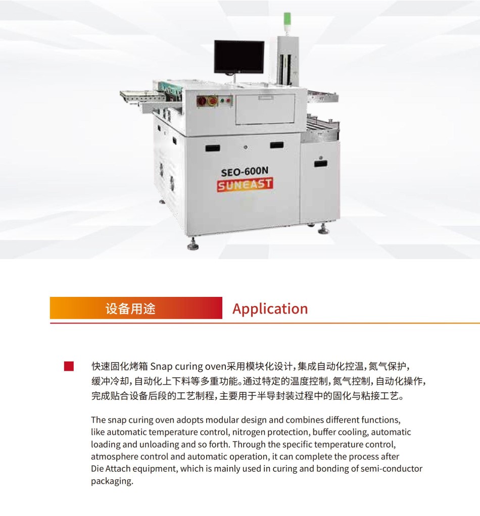 彩运网快速固化烤箱SE0-600N采用模块化设计,集成自动化控温,氮气保护,缓冲冷却,自动化上下料等多重功能。通过特定的温度控制,氮气控制,自动化操作,完成贴合设备后段的工艺制程,主要用于半导封装过程中的固化与粘接工艺。