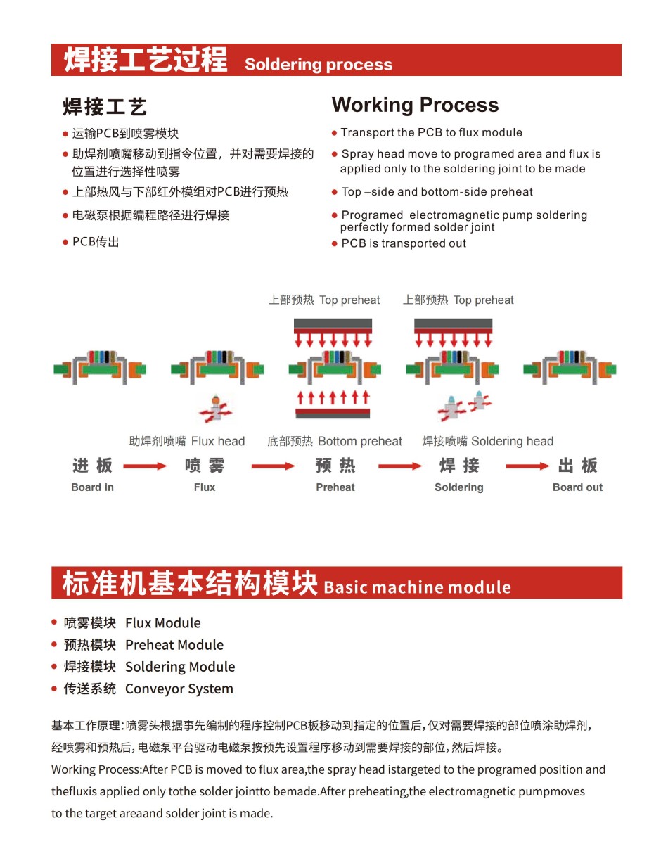 基本工作原理:喷雾头根据事先编制的程序控制PCB板移动到指定的位置后, 仅对需要焊接的部位喷涂助焊剂,经喷雾和预热后,电磁泵平台驱动电磁泵按预先设置程序移动到需要焊接的部位,然后焊接。