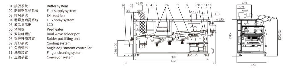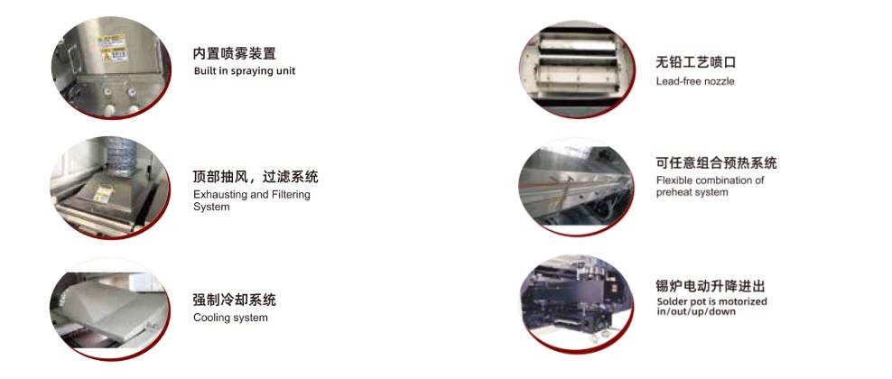 ●PC+PLC控制系统, Windows 7操作系统, 中/英文操作界面, 工艺曲线/数据自动存储功能, 助焊剂液面过低过高报警;锡液面过低报警;