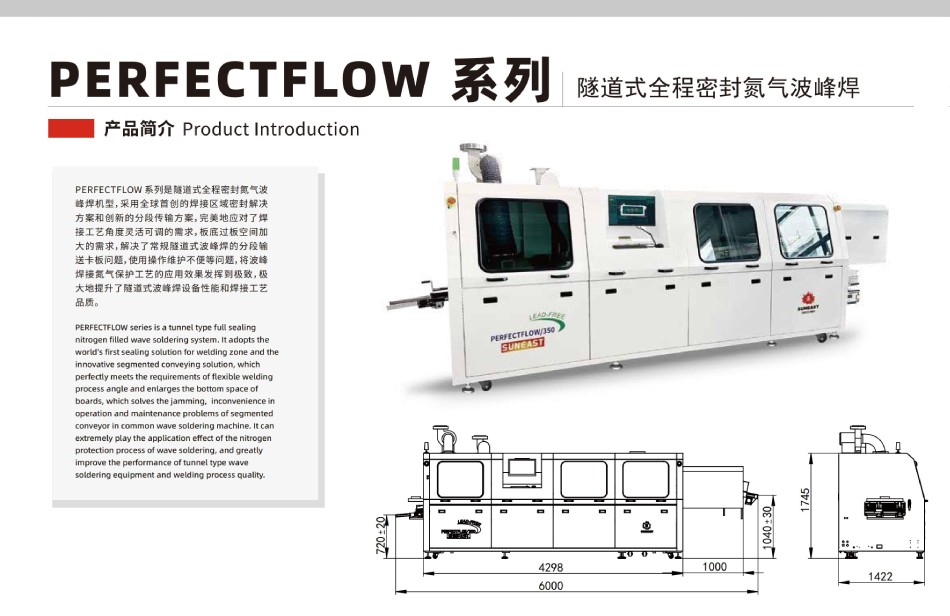 PERFECTFLOW 系列隧道式全程密封氮气波峰焊,采用全球首创的焊接区域密封解决方案和创新的分段传输方案,完美地应对了焊接工艺角度灵活可调的需求,板底过板空间加大的需求,解决了常规隧道式波峰焊的分段输送卡板问题,使用操作维护不便等问题,将波峰焊接氮气保护工艺的应用效果发挥到极致,极大地提升了隧道式波峰焊设备性能和焊接工艺品质。