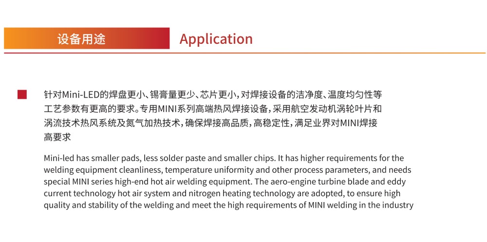 彩运网针对Mini-LED的焊盘更小、锡膏量更少、芯片更小,对焊接设备的洁净度、温度均匀性等工艺参数有更高的要求。专用MINI系列高端热风焊接设备,采用航空发动机涡轮叶片和涡流技术热风系统及氮气加热技术,确保焊接高品质,高稳定性,满足业界对MINI焊接的高要求。