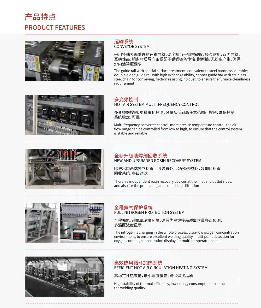 4、 全程氮气保护,各温区氮气独立控制,多点监测,可以控制在200-500PPM内;
